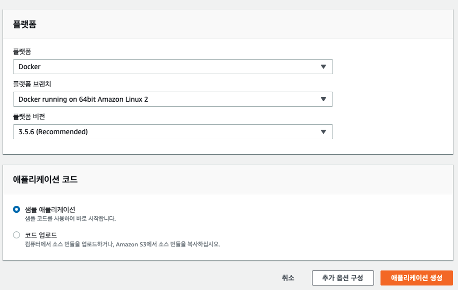 플랫폼을 Docker로 설정하고 플랫폼 분기를 ’64비트 Amazon Linux 2에서 실행되는 Docker’선택하다