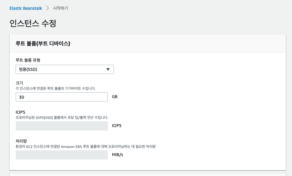 위 그림을 보시면 ‘Root Volume Type’, ‘Size’, ‘IOPS’, ‘Throughput’을 설정할 수 있습니다.